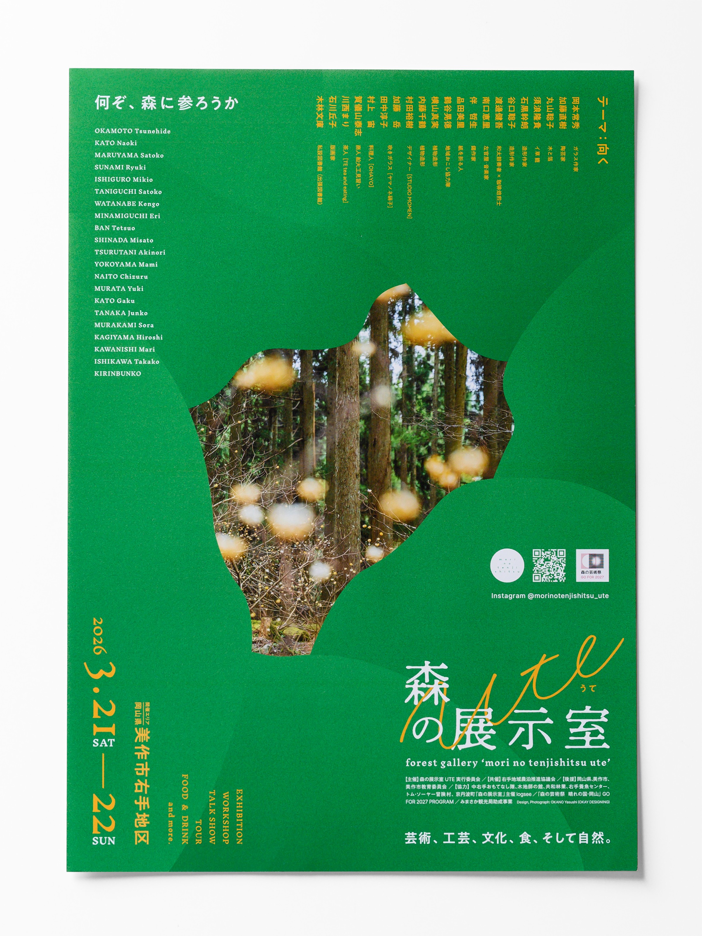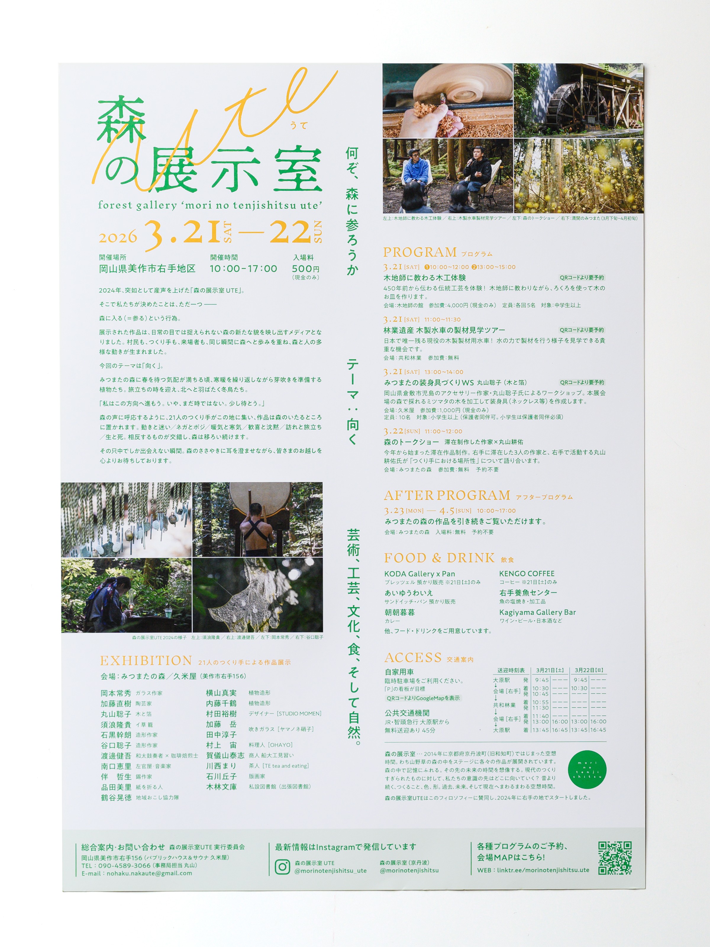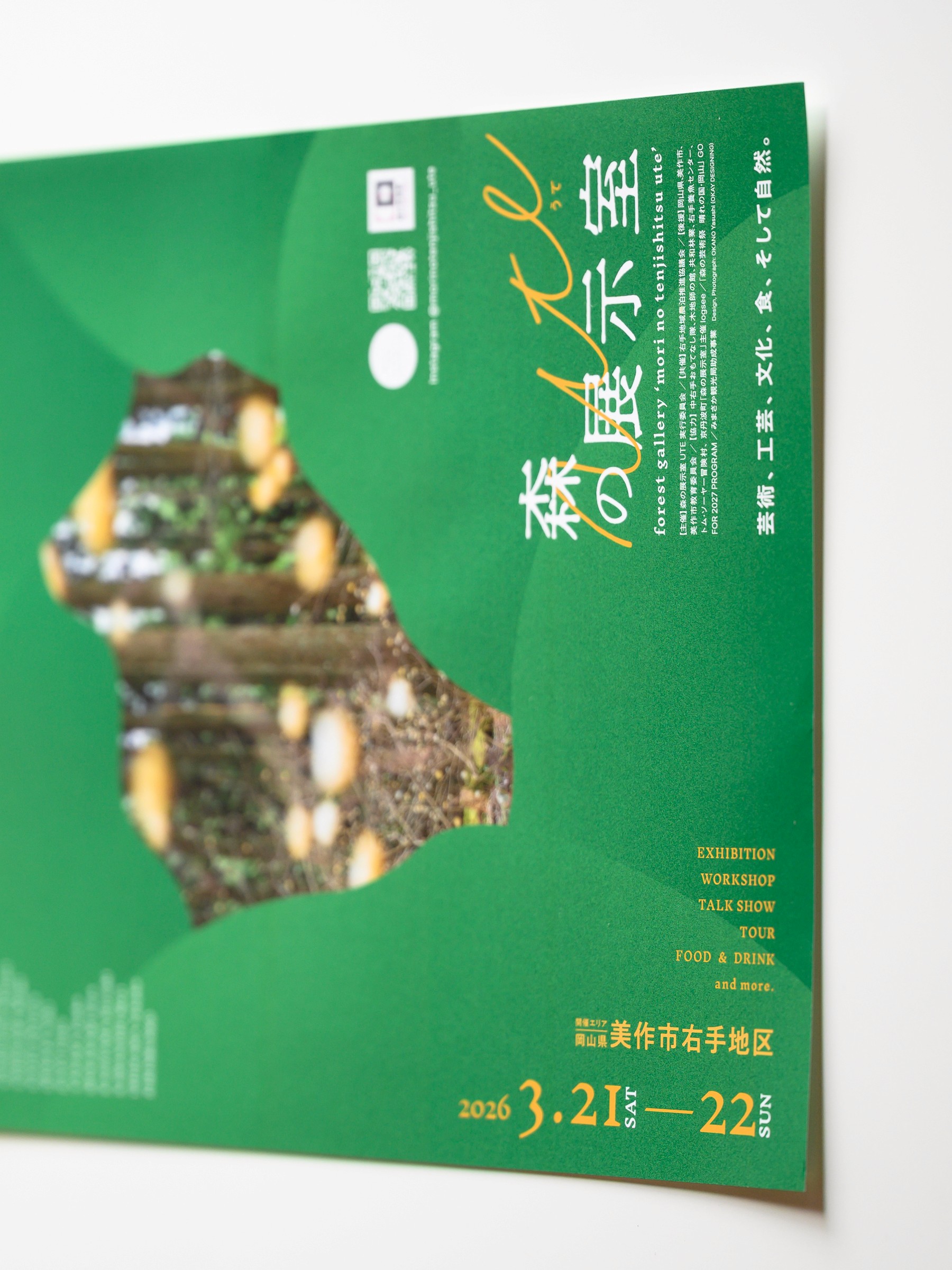 2026年3月21日・22日に美作市右手地区で開催される「森の展示室 UTE」のフライヤー・ポスターのデザインと写真を担当しています。